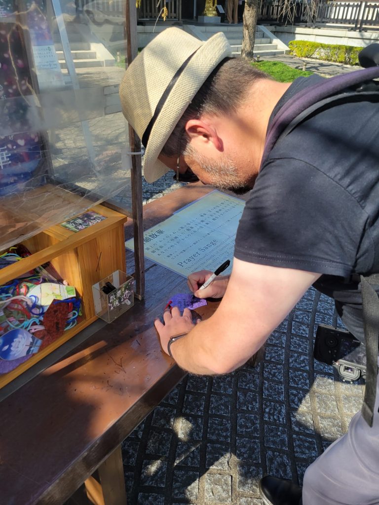 Outside in the courtyard, there was a place to write your wishes and hang them. This was under a tree with some beautiful wind chimes. There was something magical about hearing them gently make their music in the wind as I wrote down my wish. I won’t say what I wished for as I’m pretty sure the same rules apply in Japan about telling your wishes as they do in America.