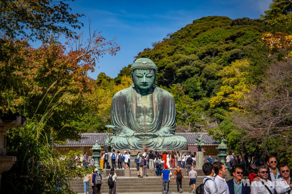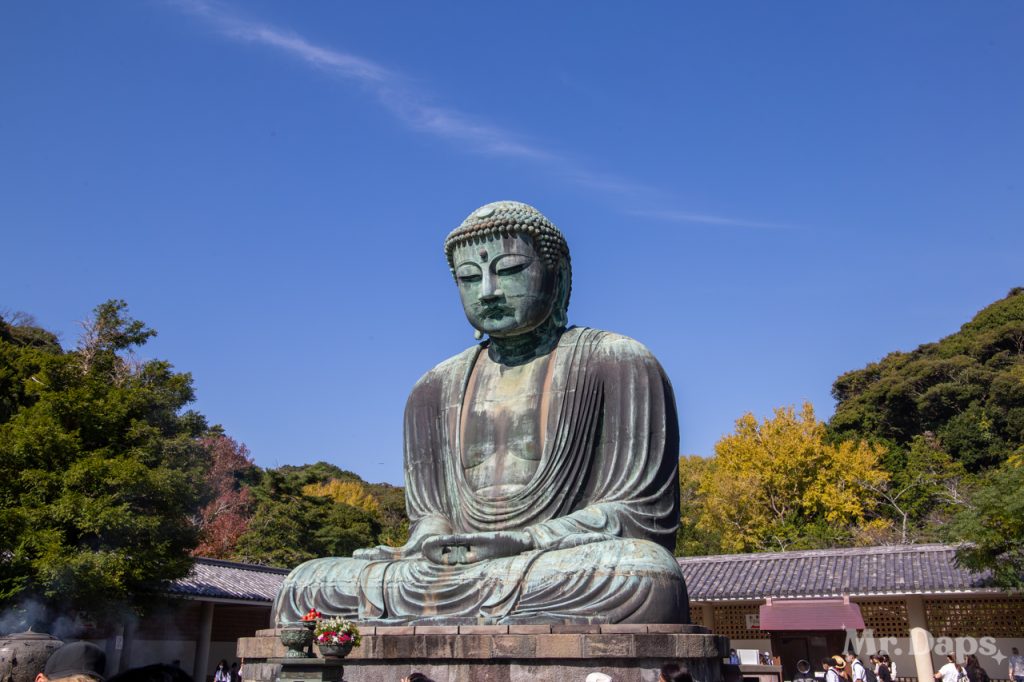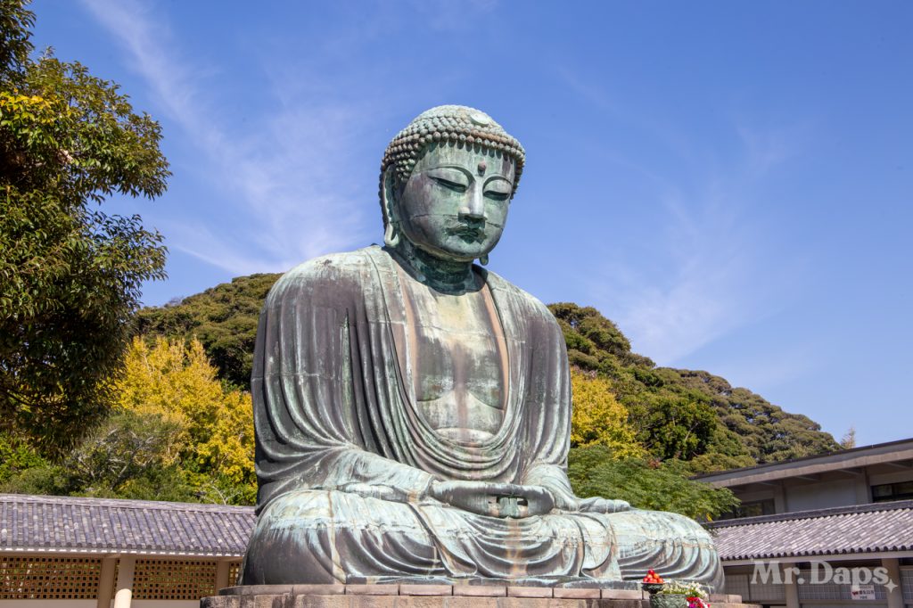 The next destination of the day was the Great Buddha of Kamakura. This is a bronze statue of Amida Buddha that is found on the grounds of the Kotokuin Temple. It is really quite spectacular to see. This statue was cast originally in 1252. Initially, it was inside a temple hall. However, multiple typhoons and a tsunami in the 14th and 15th centuries destroyed the temple buildings which eventually led to the Great Buddha standing outside in open air.