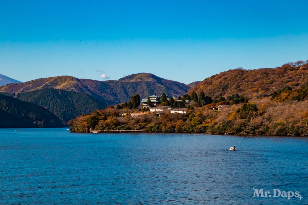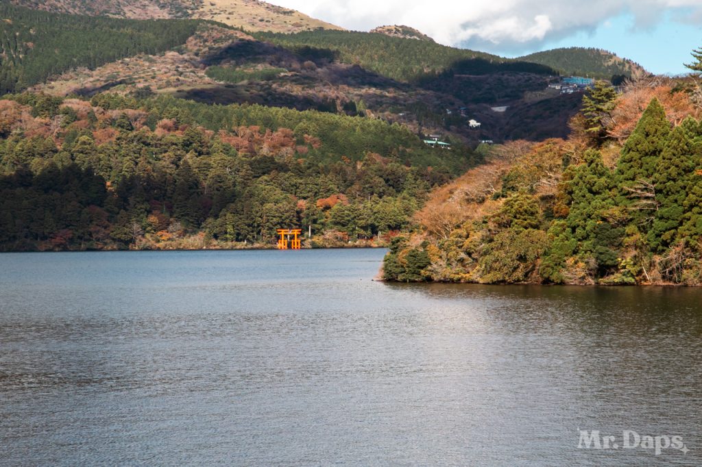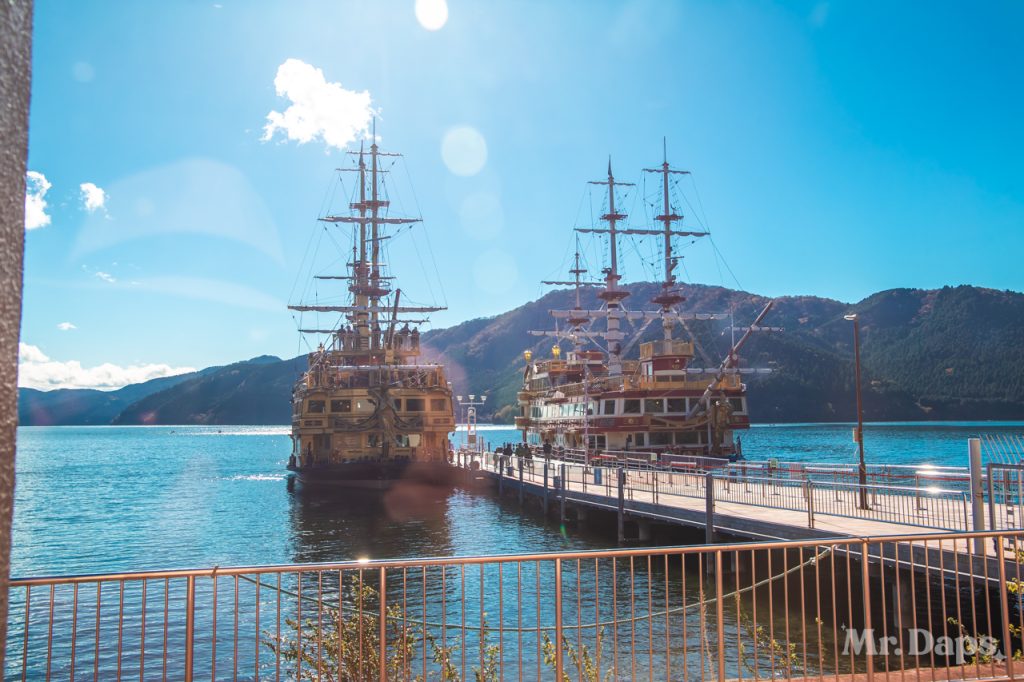 Finally, we decided to board the ropeway and make our way to our next destination at the bottom of one side of the mountain down to Lake Ashi. The trip down was absolutely stunning. At first, the side of the volcano could be seen off to one side and Mount Fuji to the other. Then the lake became more of the central focal point, along with two “pirate ships” that were docked at our destination. These were what we were here for. After disembarking from the ropeway, we made our way through the station to the lower level where the dock for the tour boats/ships were. At the ticket booth for these, a very kind gentleman informed us that if we went up one level we could combine our ropeway and cruise tickets and save some money. I was quite impressed with this interaction and the one after as we combined our tickets seeing as nobody in our party on this day spoke ANY Japanese. Thankfully, there are a lot of kind Japanese people who really were saints and kept us heading in the right direction! Tickets in hand, we wandered around and looked at the lake before getting in line to board our “pirate ship.”