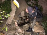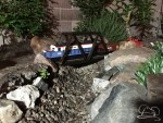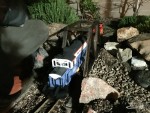 Dinner was quickly cleared and attention was turned to installing the bridge. During one of our lulls in building in the afternoon, we had dug a creek bed and then filled it with small rocks. Later we added some small succulents to accent them. A break in the surrounding larger rocks was created in anticipation of the bridge where the train track crossed the small creek. The train track was briefly disconnected and the bridge slid into place. We did have to do some jockeying to make sure the track was centered accurately to allow clearance for the train to pass through. Within minutes the bridge was in place and it was time to test out the new bridge. As the drops began to get bigger, the train looped around the track and passed across our bridge. Victory was ours and the train had a new landmark to pass through.