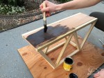 Staining the bridge we anticipated taking more coats than it actually did. The final product ended up just using one thick coat of stain. The trickiest part for this was that we needed to cover the bridge everywhere and the day was waning. We also were trying to rush a bit more by this point as we also knew that we still had sealant to spray once the stain had dried. Ideally, that should have been done a couple of hours after the staining. We pushed the time a little bit on this though.
