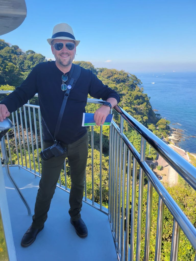 After enjoying the waterfront for a bit, it was time to climb the hill and find the lighthouse. The Kannonzaki Lighthouse is at the top of a jungle-lined staircase. It goes quite a ways up. That is one thing that is fairly common, there are lots of stairs. We climbed for quite some time and eventually came out on the top of the hill where the lighthouse was found. It was simple but it was also beautiful. The original Kannonzaki Lighthouse was the first lighthouse built in Japan. It also happens to be a lighthouse that you can climb up into.