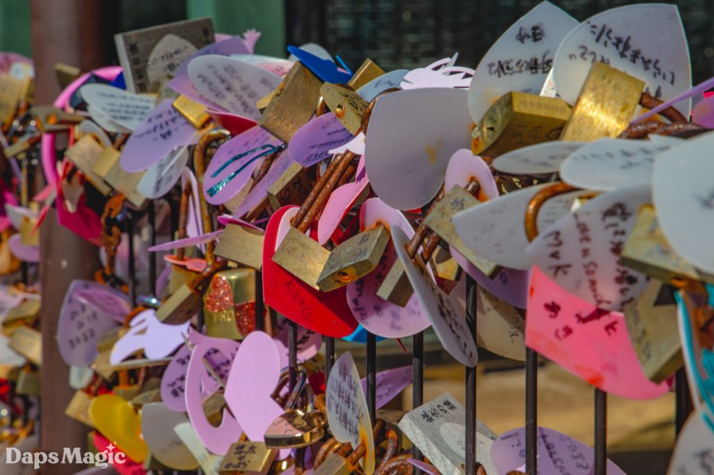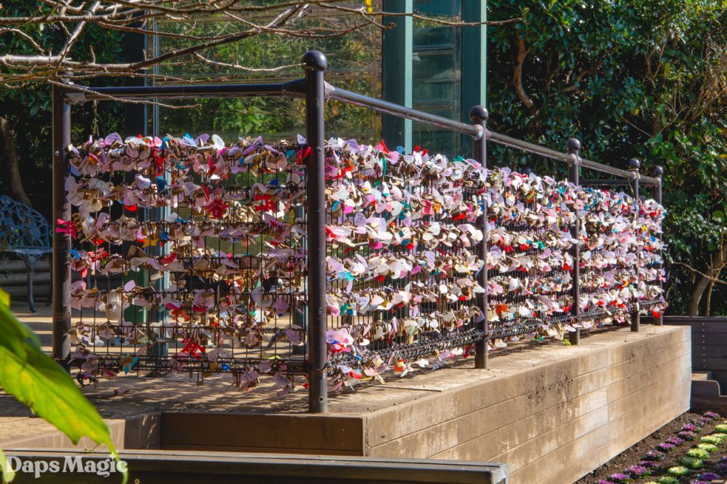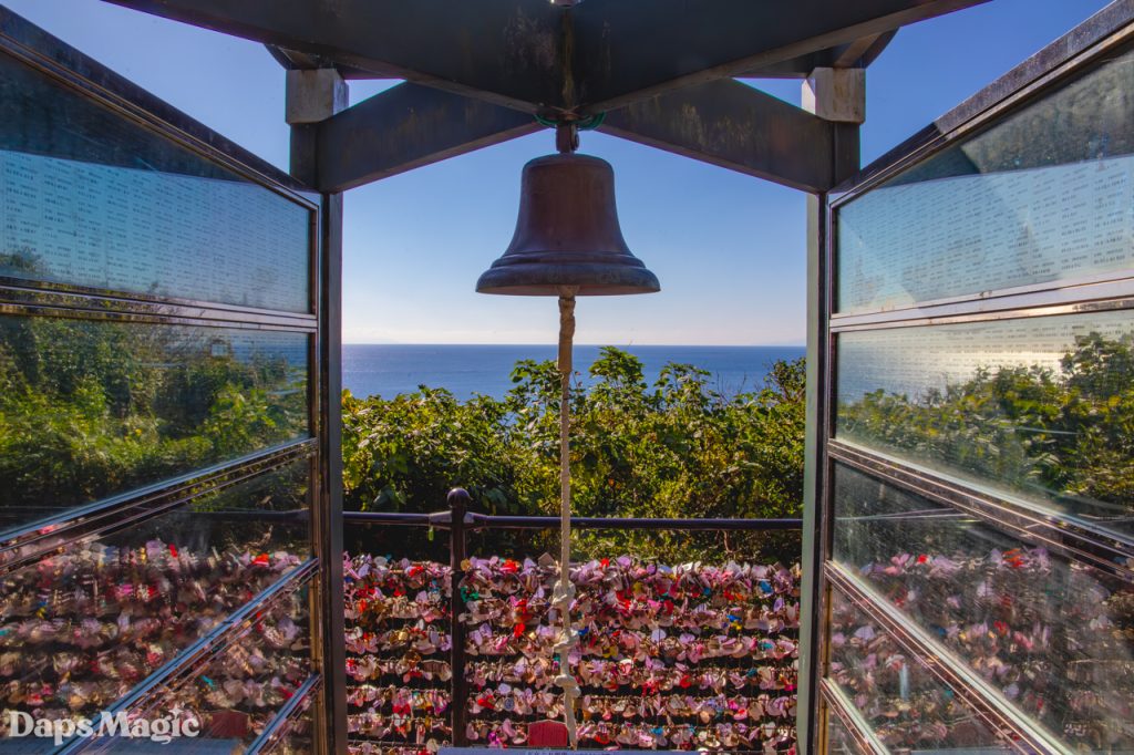 Our destination was on the far side of the hill and had a LOT of steps to climb down, now that we had reached the top. Along the way, we discovered some fun sights, including more temple buildings and also what they call the Love Bell. According to tradition, couples ring the bell together and write their names on the locks that they leave attached to the fence. This tradition connects to a legend related to the island. This legend is why we were headed to the far side of the island.
