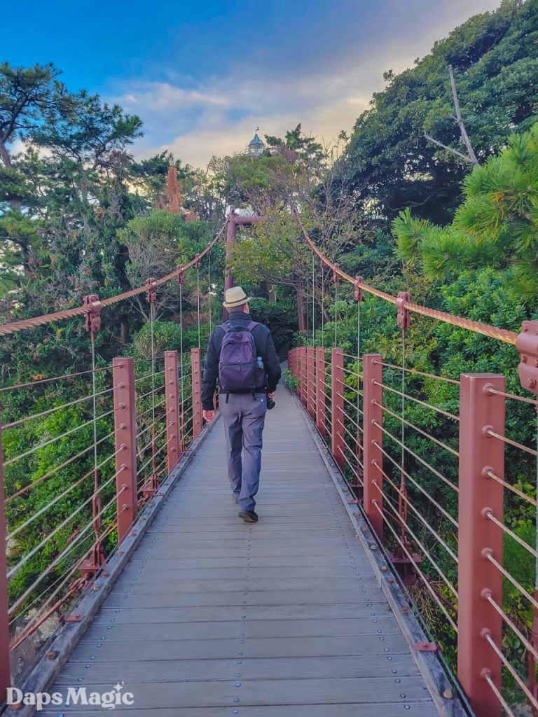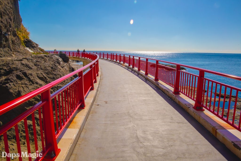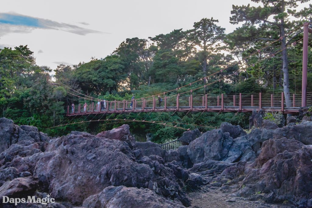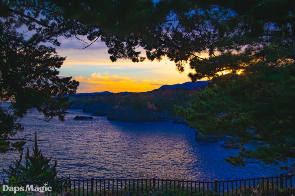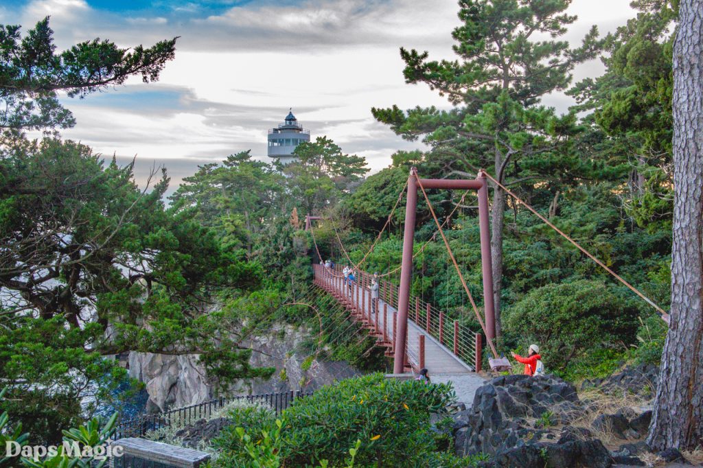 The Izu Peninsula has some incredible views that reminded me of some of the locations that James Bond would visit in some of the movies. The colors were gorgeous, the coastline rugged, and the sun was giving indications that it could be quite the sunset. However, before things got too dark, we wanted to check out the Kadowaki Suspension Bridge. The Kadowaki Suspension Bridge is nearly 160 feet long and is about 75 feet above the water below. After parking and then passing the Kadowaki Lighthouse, we made our way to the suspension bridge and crossed it. The views were stunning. As the sun hung low behind us, we enjoyed seeing the rugged Jogasaki coast and an island out in the sea. It was absolutely beautiful. We took plenty of photos of the area and of us above the ocean before returning to the suspension bridge to go and watch the sunset on the other side of the peninsula.