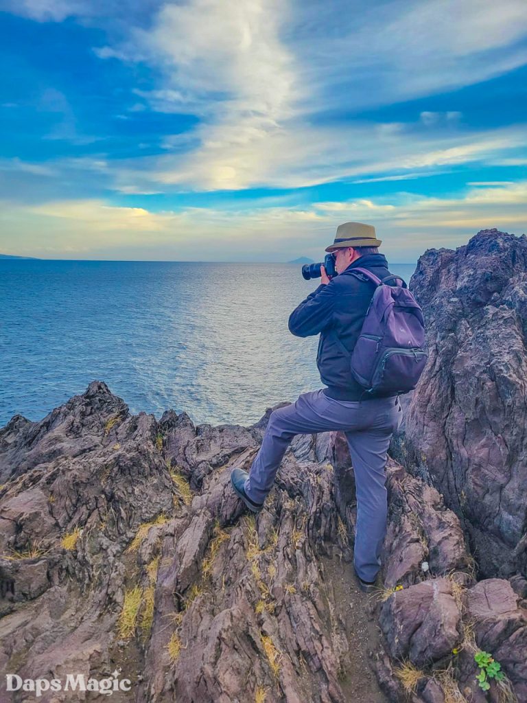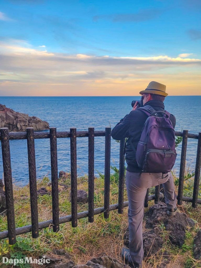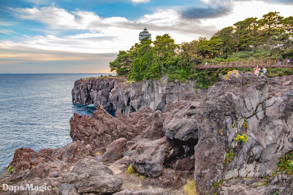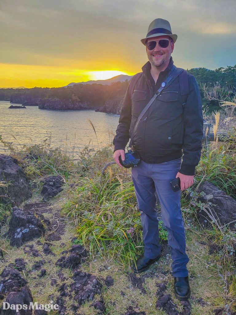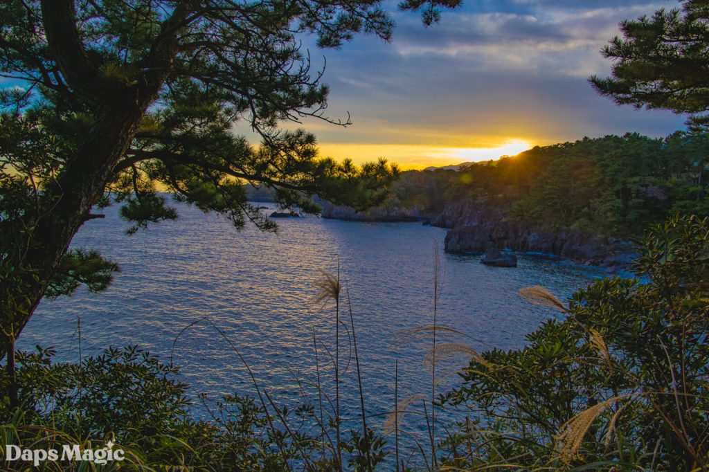 The Izu Peninsula has some incredible views that reminded me of some of the locations that James Bond would visit in some of the movies. The colors were gorgeous, the coastline rugged, and the sun was giving indications that it could be quite the sunset. However, before things got too dark, we wanted to check out the Kadowaki Suspension Bridge. The Kadowaki Suspension Bridge is nearly 160 feet long and is about 75 feet above the water below. After parking and then passing the Kadowaki Lighthouse, we made our way to the suspension bridge and crossed it. The views were stunning. As the sun hung low behind us, we enjoyed seeing the rugged Jogasaki coast and an island out in the sea. It was absolutely beautiful. We took plenty of photos of the area and of us above the ocean before returning to the suspension bridge to go and watch the sunset on the other side of the peninsula.