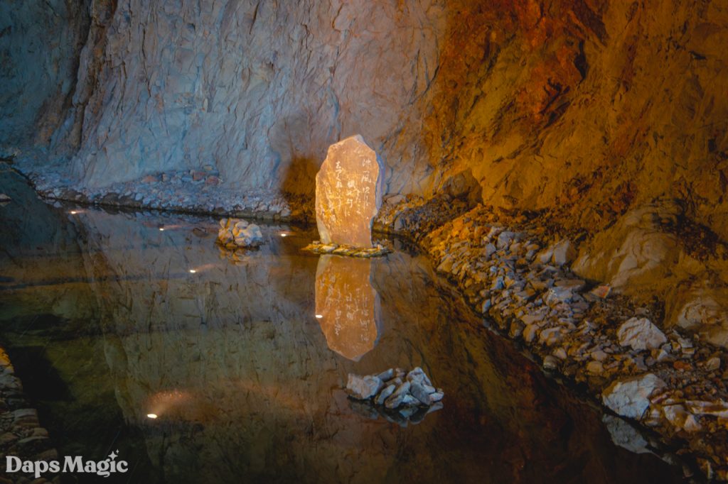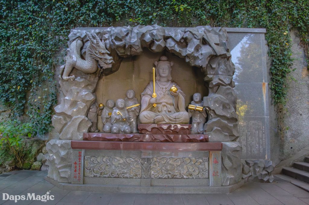 After returning our candles to the booth, we exited the first tunnel and headed to the second cave. This is where the dragon is located. In the back of this cave is a statue of a dragon. This is believed to be the dragon that guards the area since falling in love with Benzaiten. Clapping leads to lights flashing and the sound of thunder. It really was kind of fun, although it intimidated my nephew at first. However, he overcame this fear and helped me shoot a video of the dragon being brought to life with his claps. I did have to wonder why there was only one head on this five-headed dragon but I still really enjoyed getting to see it. As we made our way out of the caves, we passed an inscribed stone in a pool of water. I’m not sure what it was for but it was very peaceful and beautiful.