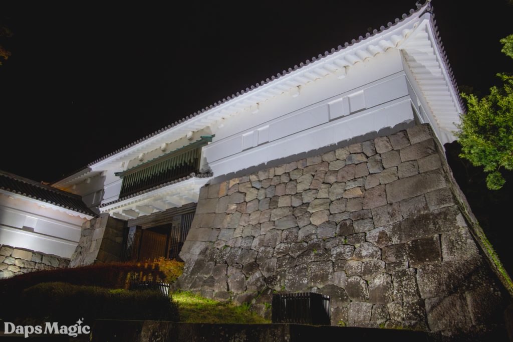 By the time we arrived at Odawara Castle, it was very dark. Because of this, parking was not a problem. As we wandered around the outside of the castle grounds, we wondered how much we would be able to see. It was still early evening, but it was dark and the grounds seemed deserted. As we strolled along, we came across one of the main gates and entered it. The area was really quite beautiful and peaceful. We slowly made our way further into the grounds and took pictures of the architecture, that thankfully had been lit up at night.