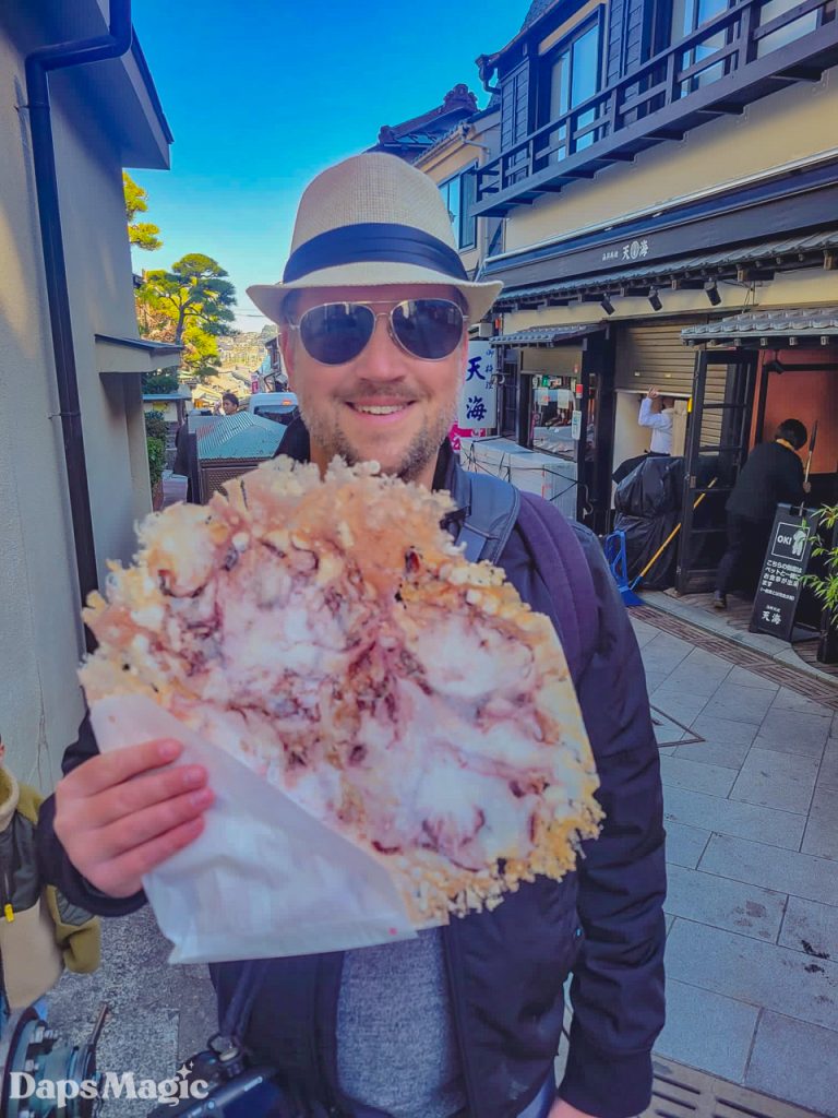 Within minutes, we were walking around enjoying the ocean views of Mount Fuji, the street market, and behind that the first of several shrines on the Island. We would see many of them throughout the course of the morning adventure. But first, it was time for a snack. In this case, it was one of the more interesting snacks I had during this trip. Along the street market, there was a station where you ordered through what looked like a vending machine. From this, you received a ticket and this location would make your order. Our order this time around was for an octopus cracker. This was a fascinating thing. It looked like three small octopus were picked and then put on a grill that was made of two plates. These two plates squished the octopus at great pressure while also cooking the octopus. From some quick research, it appears that the octopus is cooked at 365°F and receives 1 ton of pressure! It really was interesting to watch. The resulting cracker was also interesting to look at and interesting to eat. My first observation about the cracker was how big it was! I then was shocked at how much of a cracker texture it had. It broke like a cracker and we shared it. My nephews, niece, and sister all really seemed to enjoy it. I did too. It didn’t have a super strong flavor. The octopus could be tasted and there was a tiny bit of chewiness. Overall, it was a decent snack. I probably would have preferred it in the afternoon over the morning but… I understand that the line for this particular snack gets crazy busy in the afternoon!