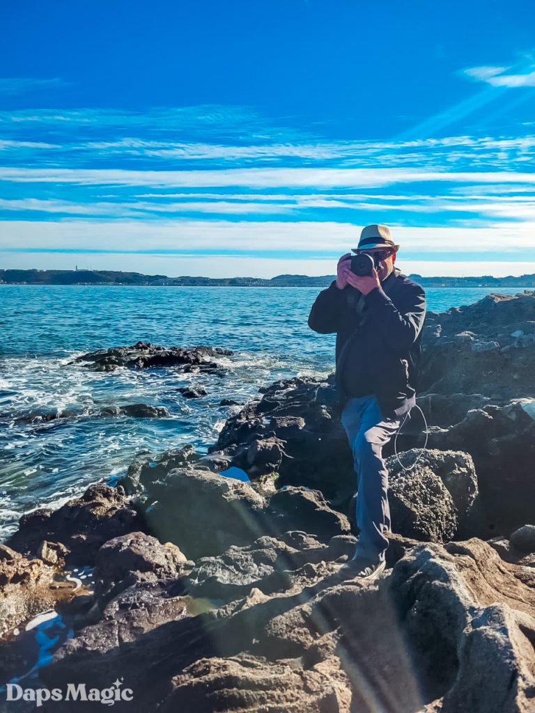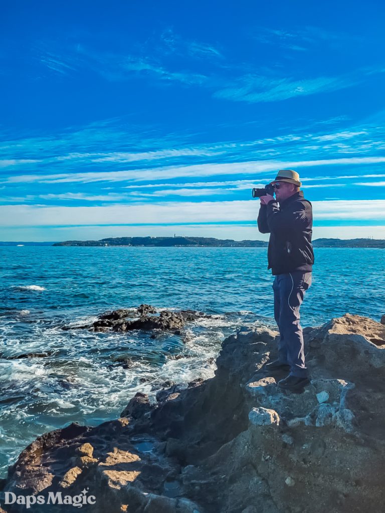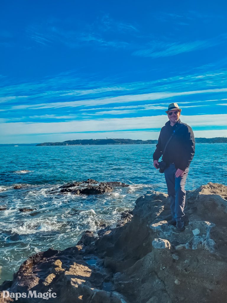 As we continued to explore the island, we ended up going down some stairs and discovering a lovely rocky shoreline. There were people fishing here. Others were taking photos, just like we were. We spent some time hanging out here. The adults took photos while the kids climbed all over the rocks. Finally, we decided to climb further up the island and see what else there was to see.