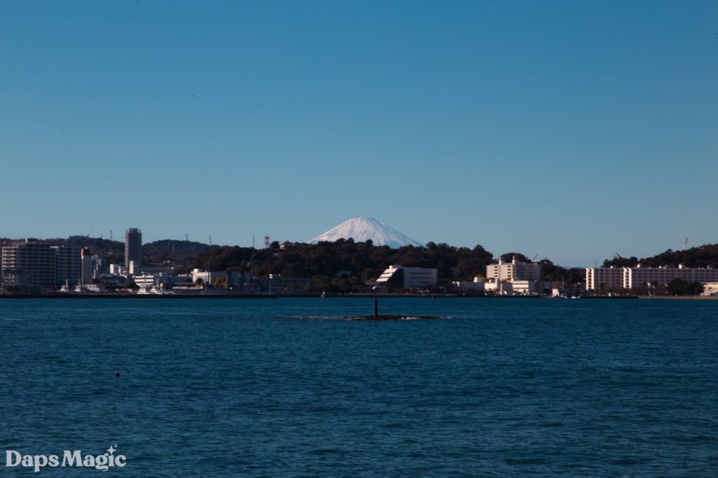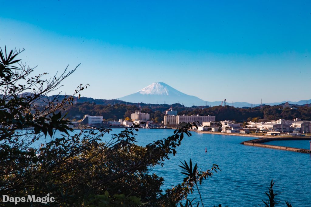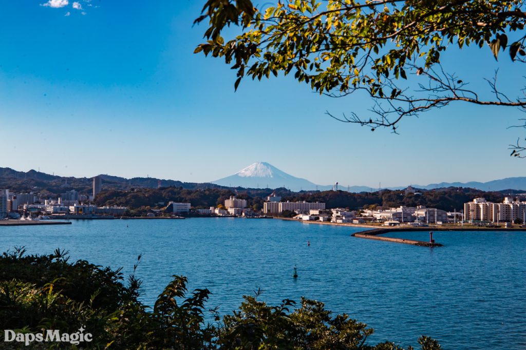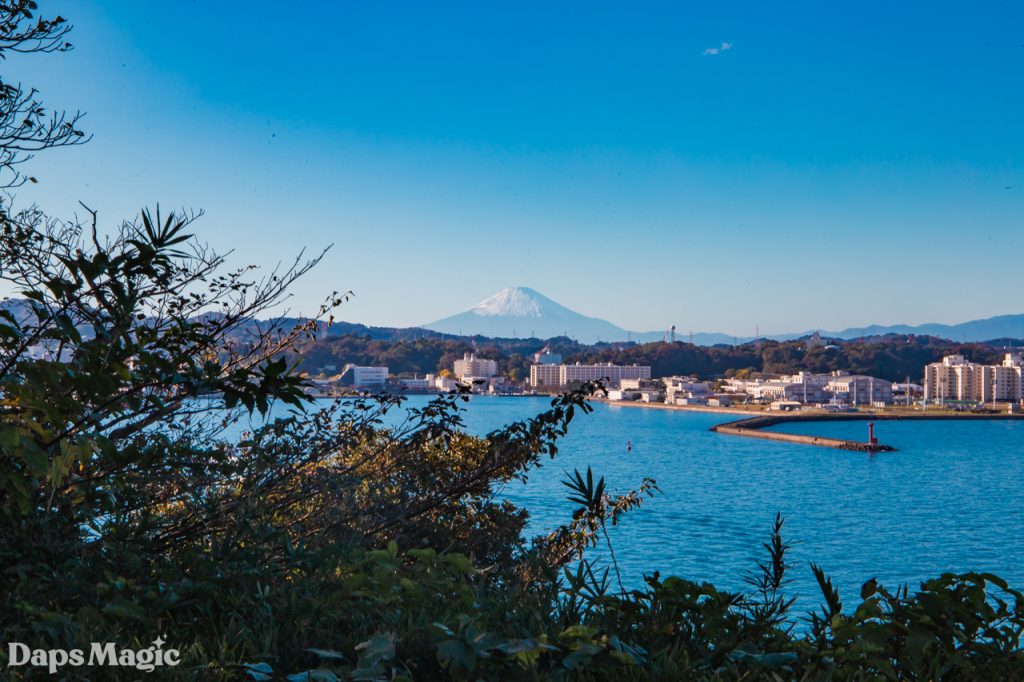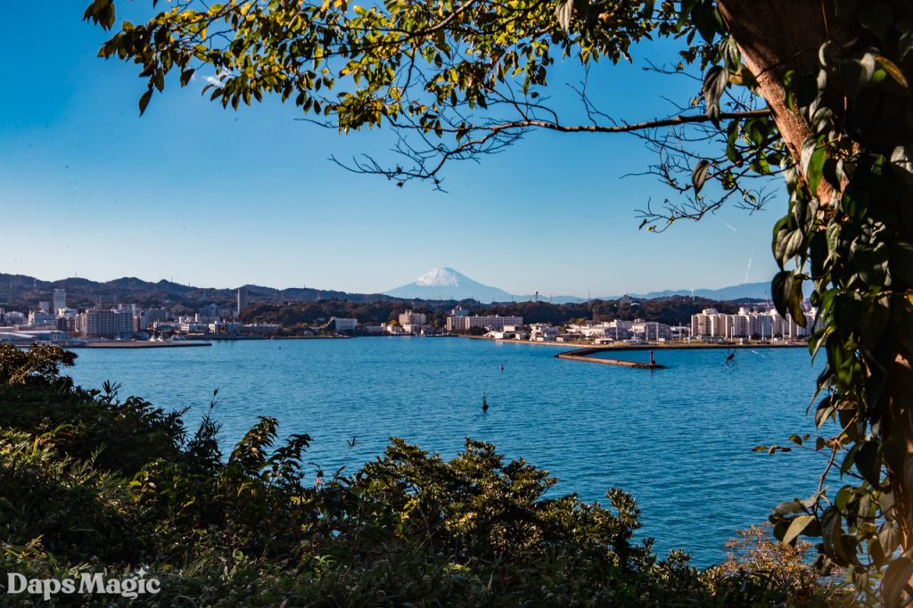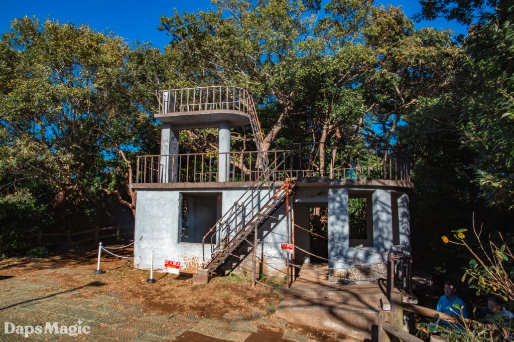 As it turns out, Sarushima Island continued the trend that I had experienced throughout Japan of having a LOT of stairs. Along the way, a couple of people were posing for photos on these stairs that climbed up through the jungle. They seemed to be dressed as anime characters from some series…or maybe just had the style. After waiting for them to take more photos and then they stepping aside to let us pass, we continued to the top of this hill. At the top, there was an abandoned cement bunker at the edge of a clearing. The clearing had some picnic tables and an absolutely beautiful view of Mount Fuji. We spent several minutes just enjoying the view.